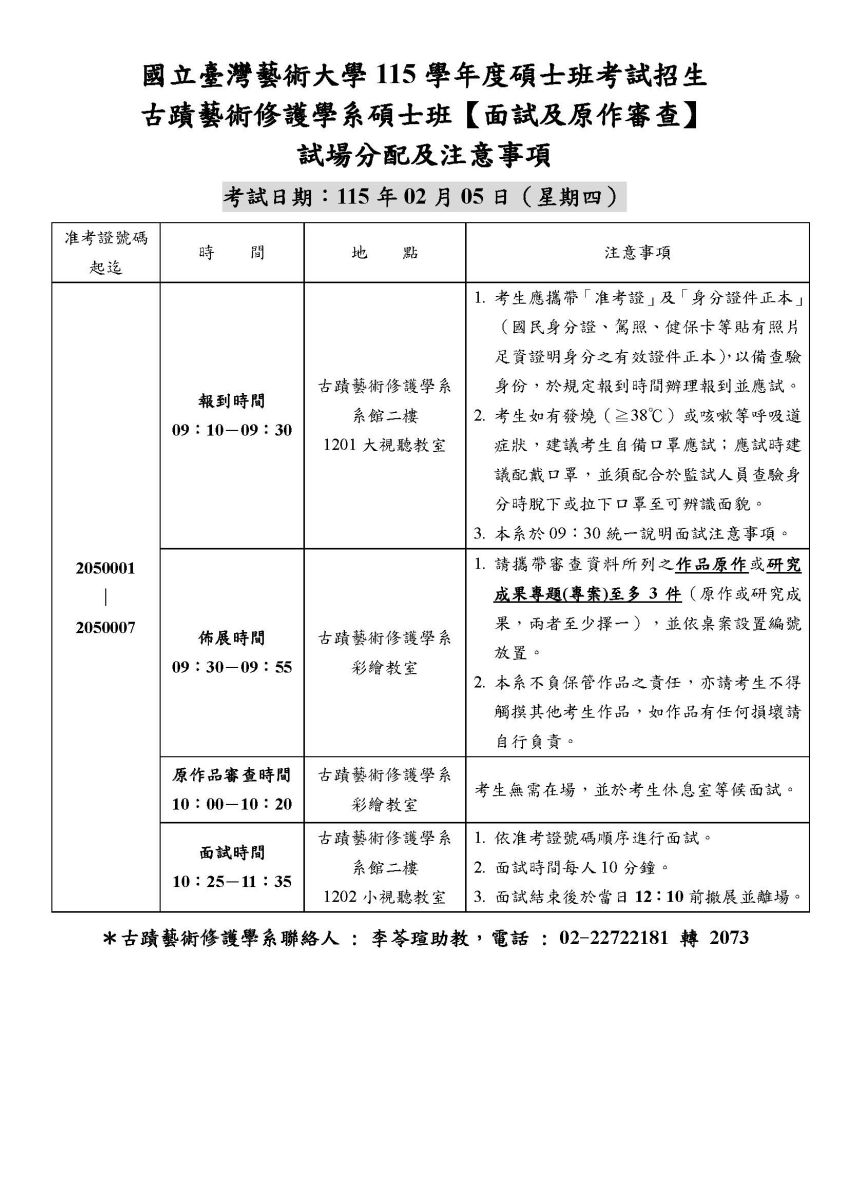 115學年度古蹟藝術修護學系碩士班考試招生試場分配及注意事項公告